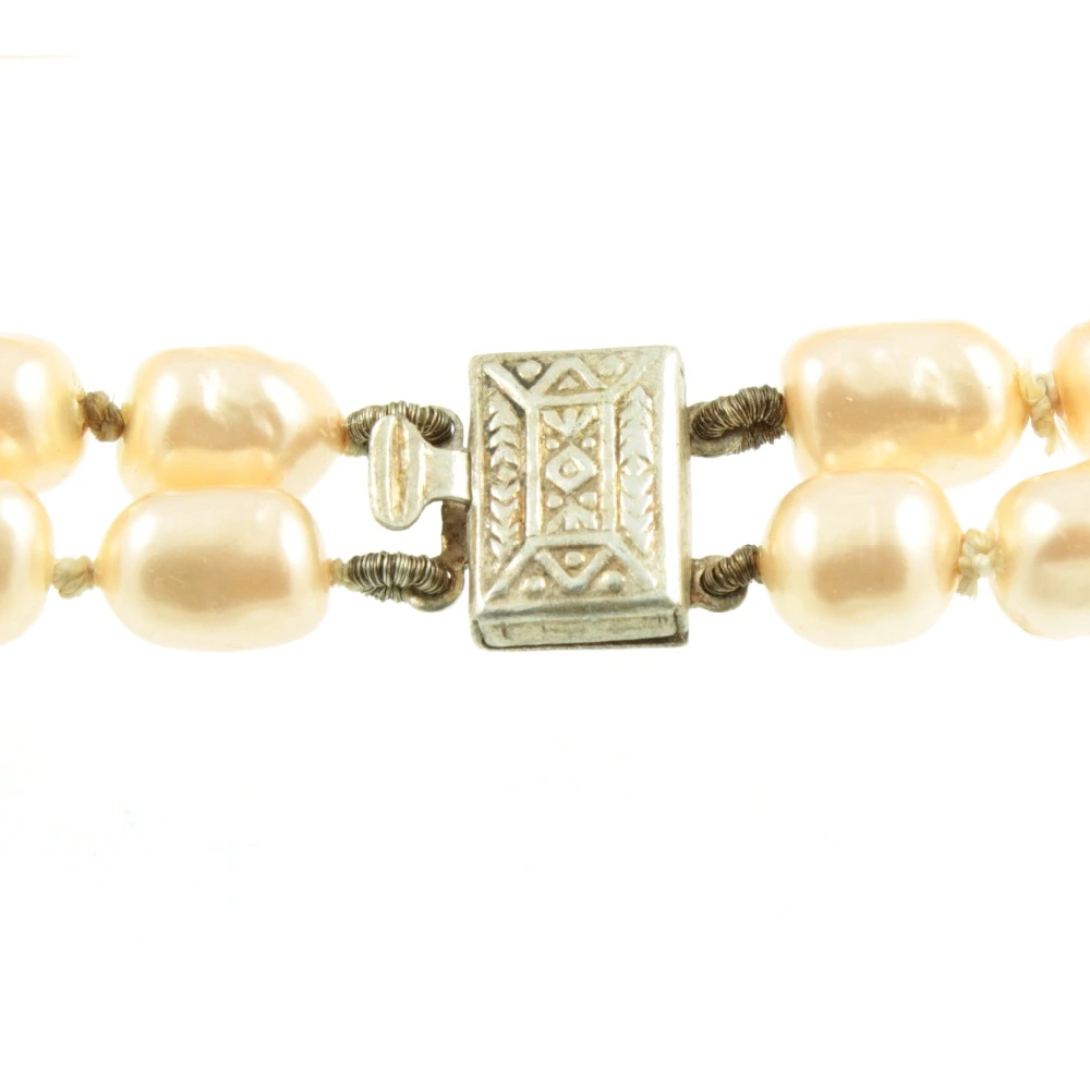 A Retro Pink Faux Pearl Bracelet. Champagne pink glass pearls have been hand-strung and individually knotted. Then securely fixed to a decorative silver-tone bracelet push-in box clasp. A very pretty vintage costume bracelet.