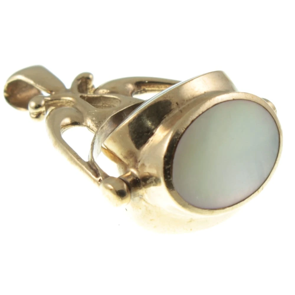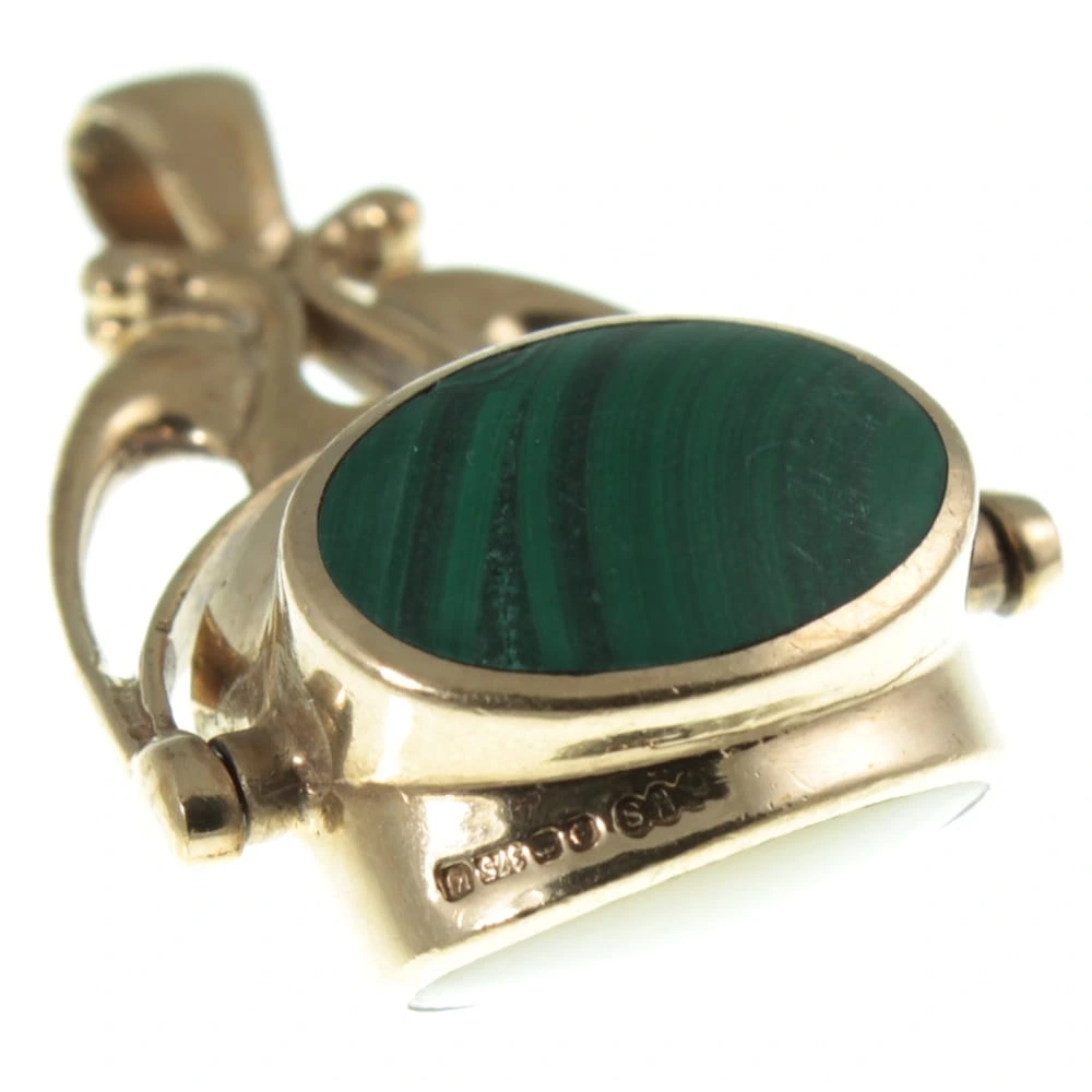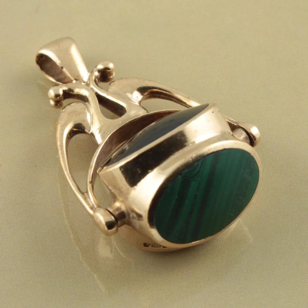 A pretty Retro Triple Sided Fob Pendant. Three oval-cut gemstones, Malachite, Onyx and Mother of Pearl form a trihedron-shaped swivel, which is suspended from Art Nouveau style open scrollwork. A well-made and wearable piece of Retro Jewellery