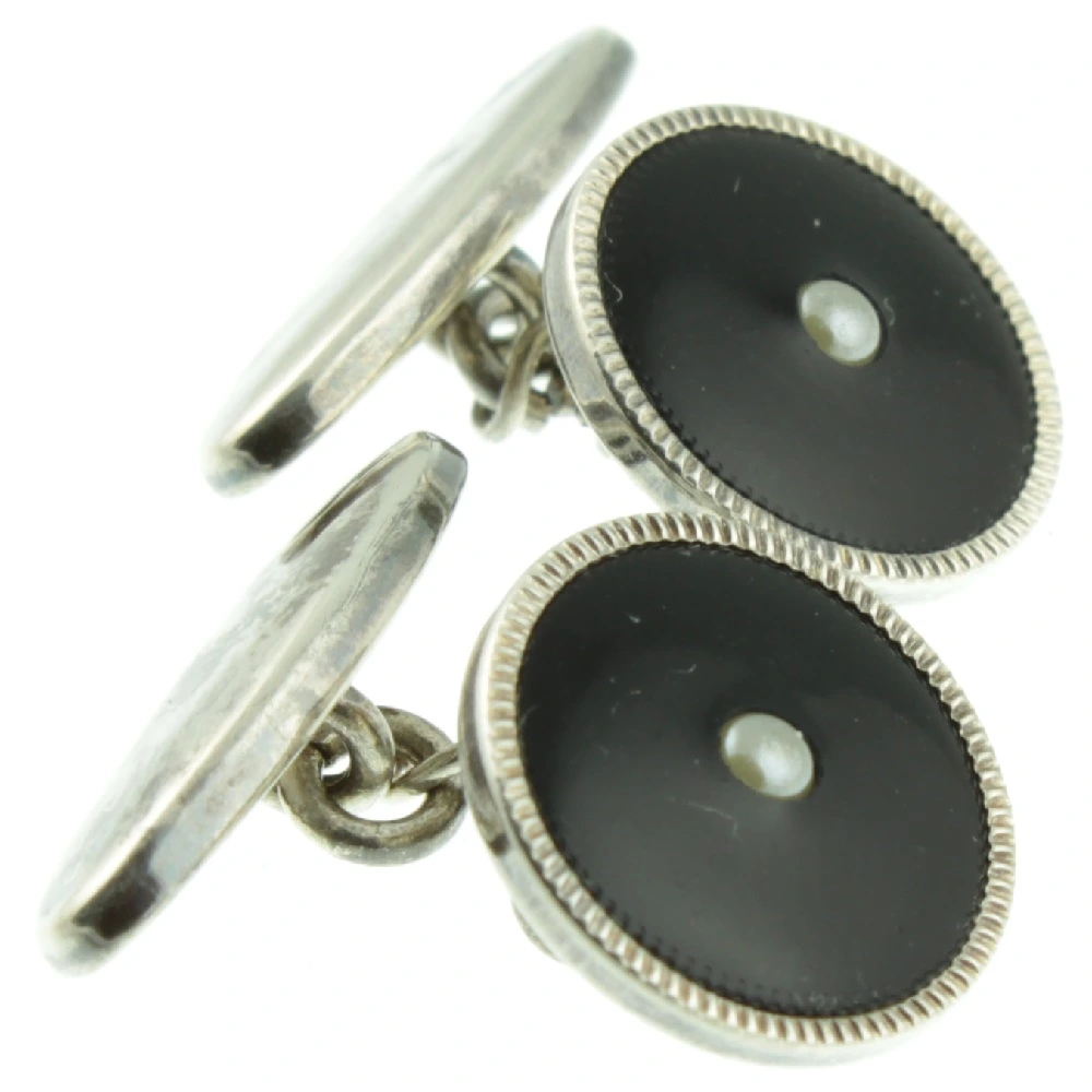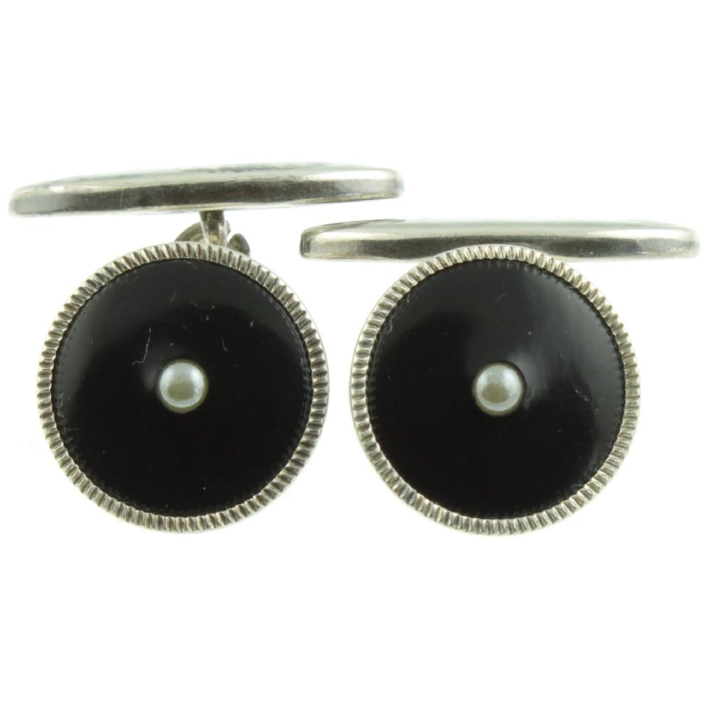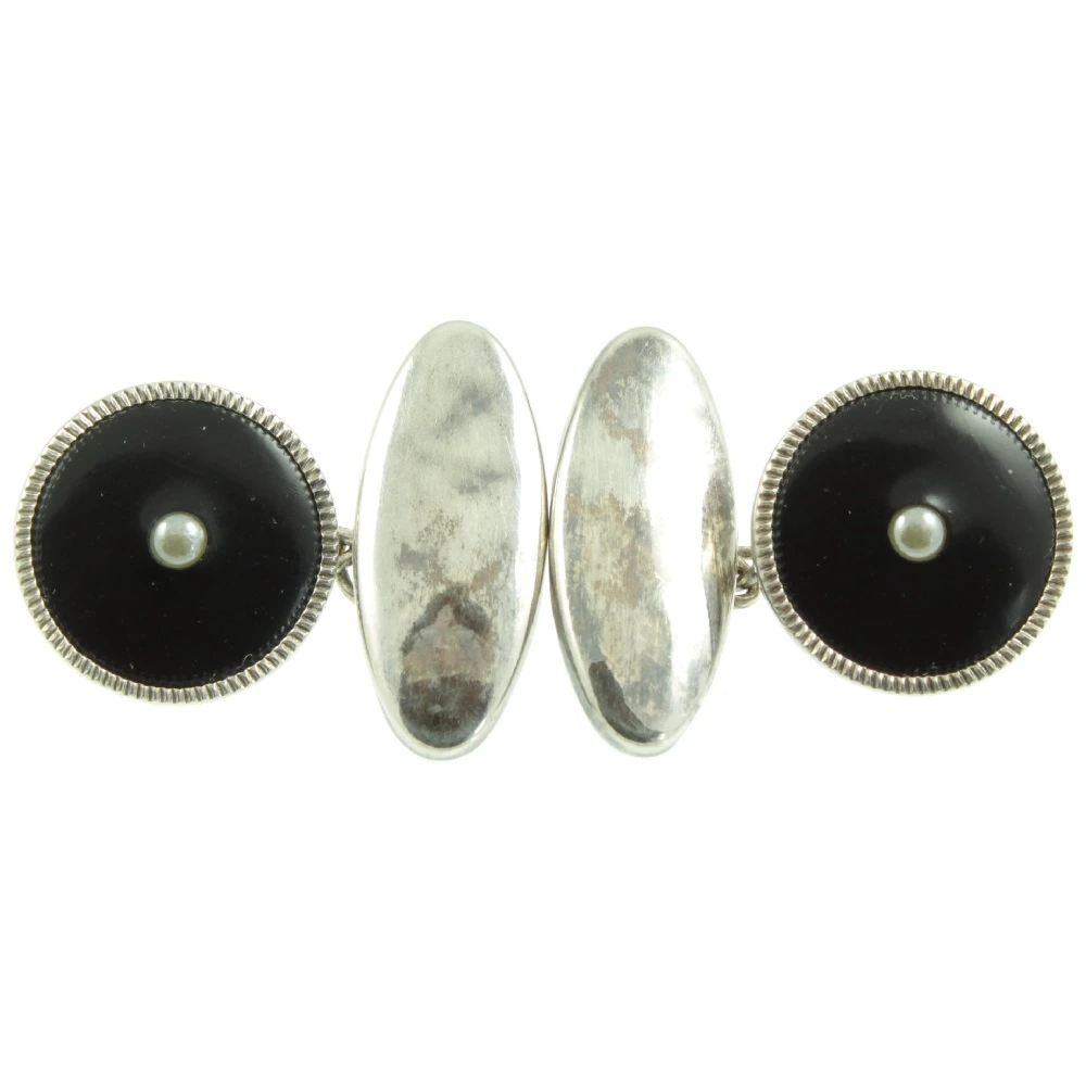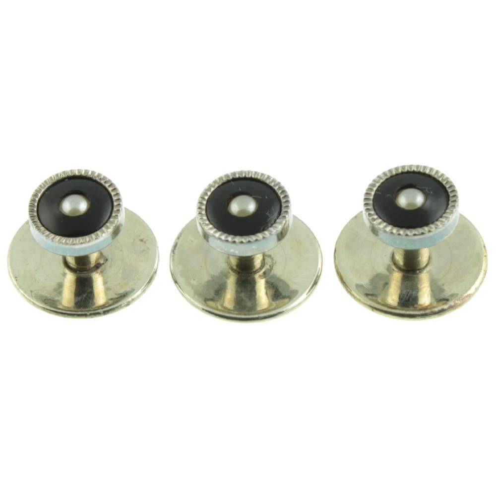 A stylish Seed Pearl and Onyx silver dress set. The set consists of a pair of cufflinks and three studs. Natural split seed pearls are set in onyx and finished with decorative sterling silver borders, which creates a beautiful contrast. This timeless dress set is presented in its original box.