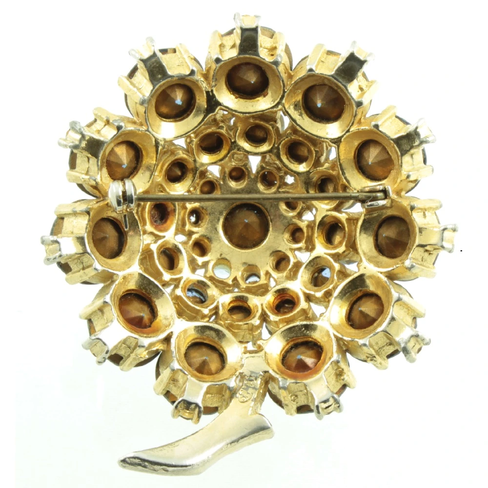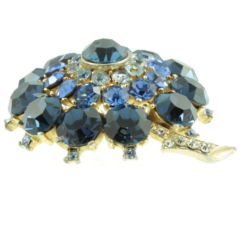 A sparkling 1960s Vintage Sphinx Blue Rhinestone Brooch. Beautiful concentric circles of rhinestones, starting with a royal blue outer circle which moves to a sky blue middle circle and then to a pale blue inner circle. Finished with a single royal blue rhinestone at the centre. These rhinestones are set in a closed-back gold tone setting and have been signed by Sphinx. An eye-catching piece of vintage costume jewellery.
