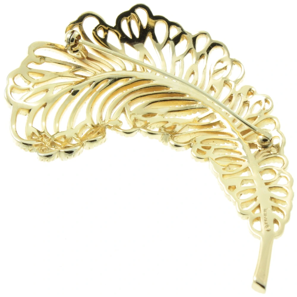 A rich yellow-gold Trifari Ostrich Feather Brooch. A gold-plated ostrich feather brooch, signed by Trifari. A quality piece of vintage costume jewellery in mint condition.