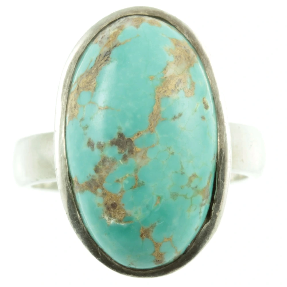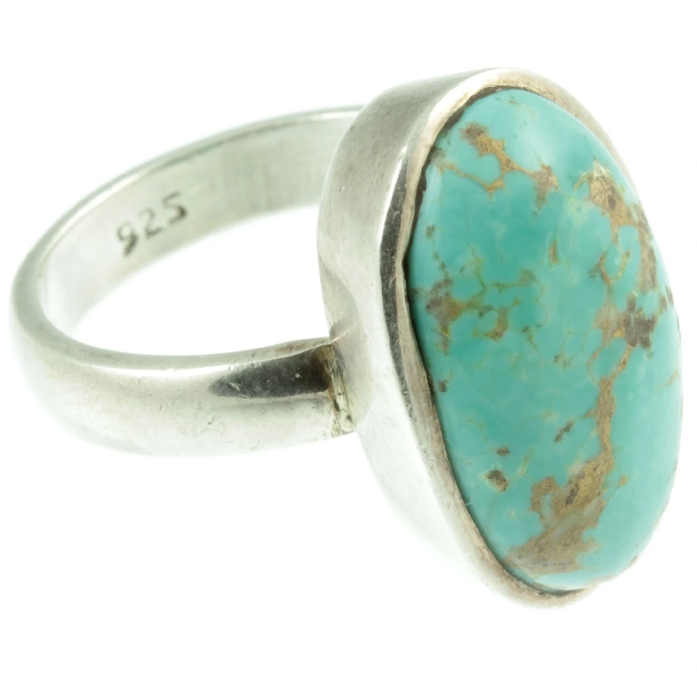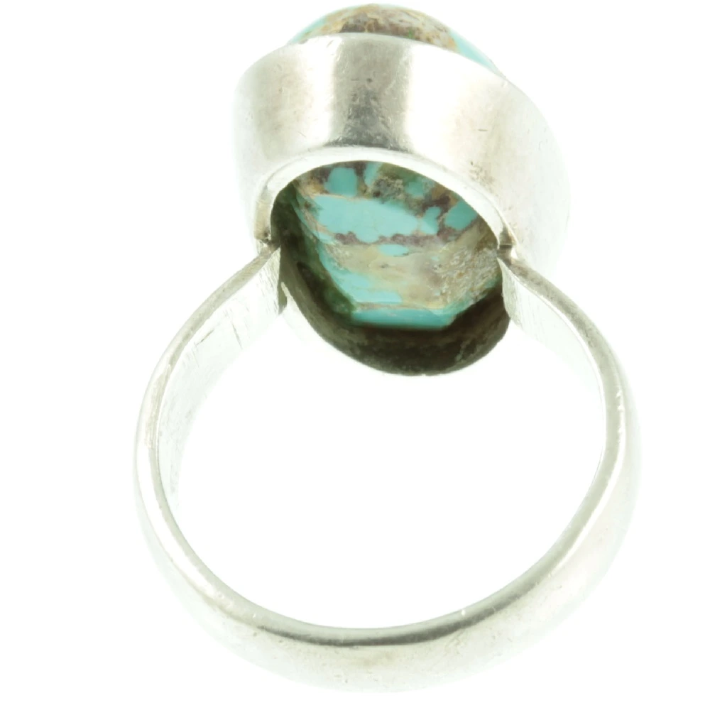 An impressive Mid-Century Turquoise and Silver Ring. A large oval cabochon turquoise gemstone weighing 15.75ct is mounted in sterling silver, using a rub-over setting. A beautiful 1950s Scandinavian inspired artisan made vintage ring