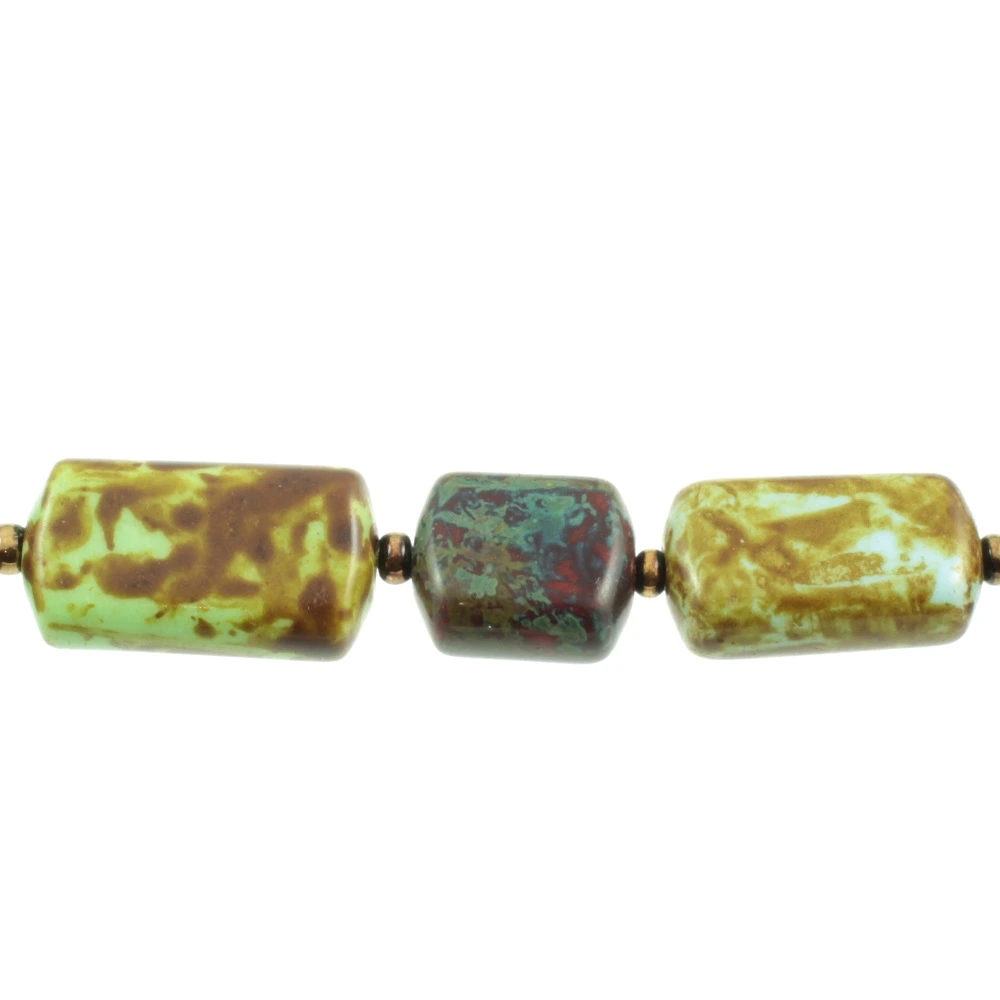A gorgeous Venetian art glass necklace. Handcrafted opaque glass beads, together with small gold-tone glass spacers have been hand strung and set to a brass barrel clasp. A one-of-a-kind vintage costume necklace.