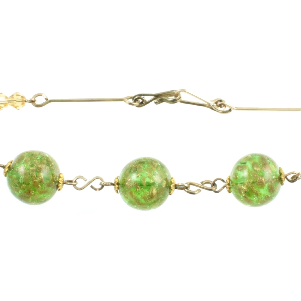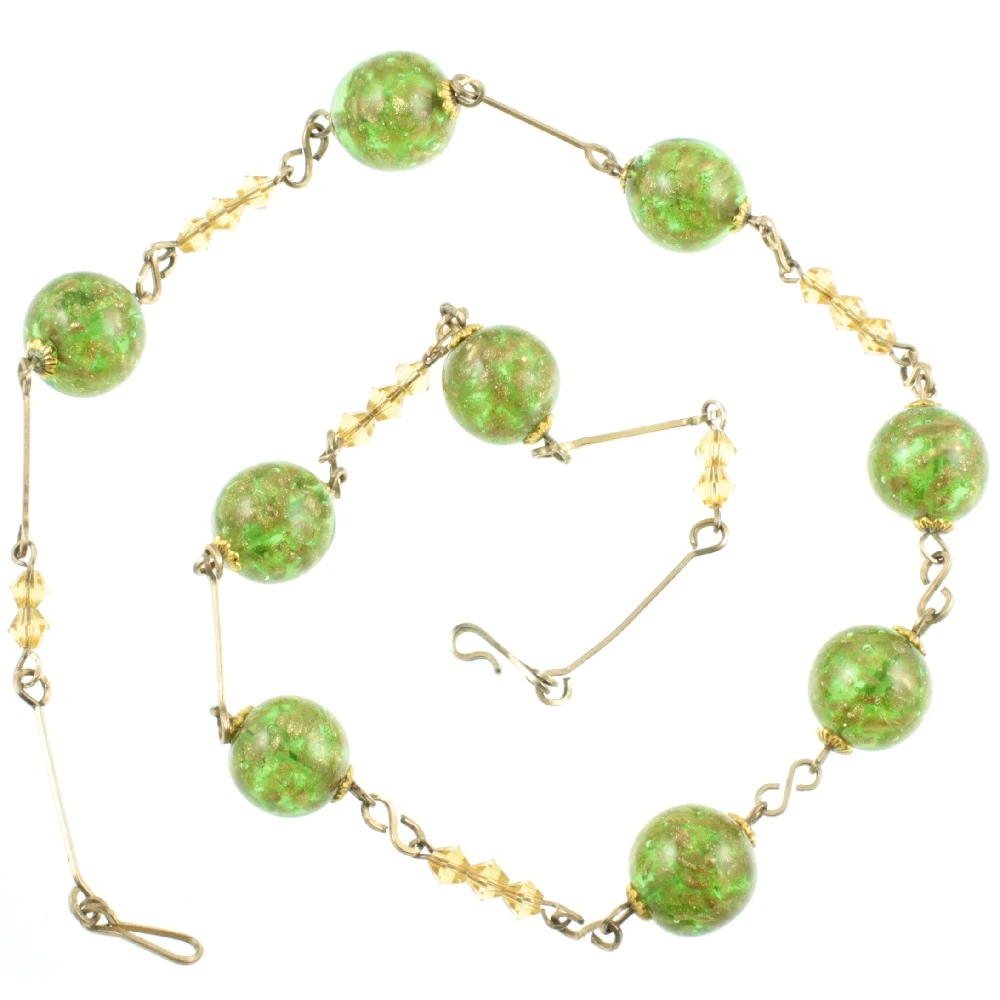 A very pretty Art Deco Venetian Aventurine Swirl Glass Necklace. These shimmering glass beads were made by a Venetian artist, who mixed crushed aventurine gemstone dust with molten glass. The necklace chain is made of fetter links with small faceted amber glass pieces intermittently spaced. Which gives further depth to this gorgeous necklace. A fine example of the very high standards to which Venetian artists work.