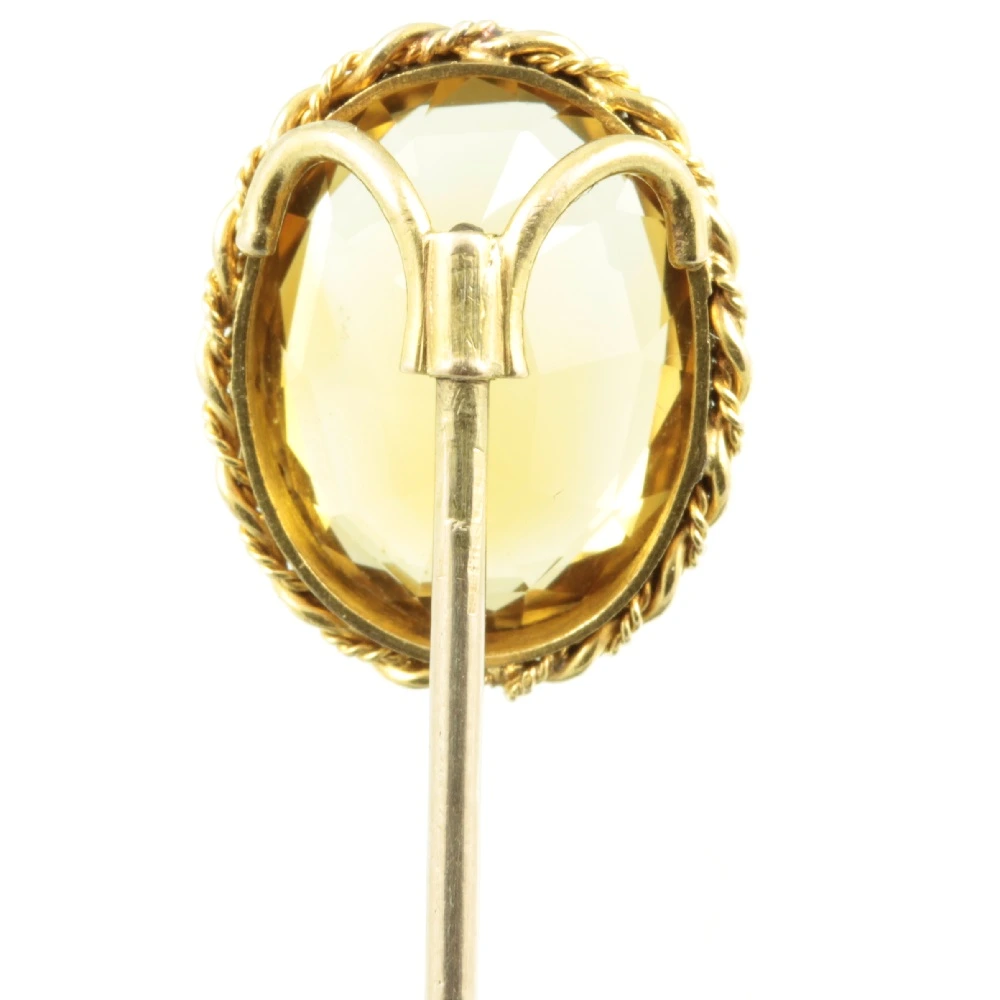 An exceptional Victorian 15ct Gold Citrine Tie Pin. This bright and vibrant oval-cut citrine gemstone, weighing 4.7ct has flawless clarity and a beautiful depth of colour. November’s birthstone citrine was very popular during the 19th century and was widely used in both jewellery and in intaglio work. This antique gemstone is set in rich 15ct gold employing a rub-over setting and surrounded by a double border of twisted gold ropes. An elegant and understated piece of fine antique gentlemen’s jewellery. All of our tie pins are sold with a stopper fitted to the point.