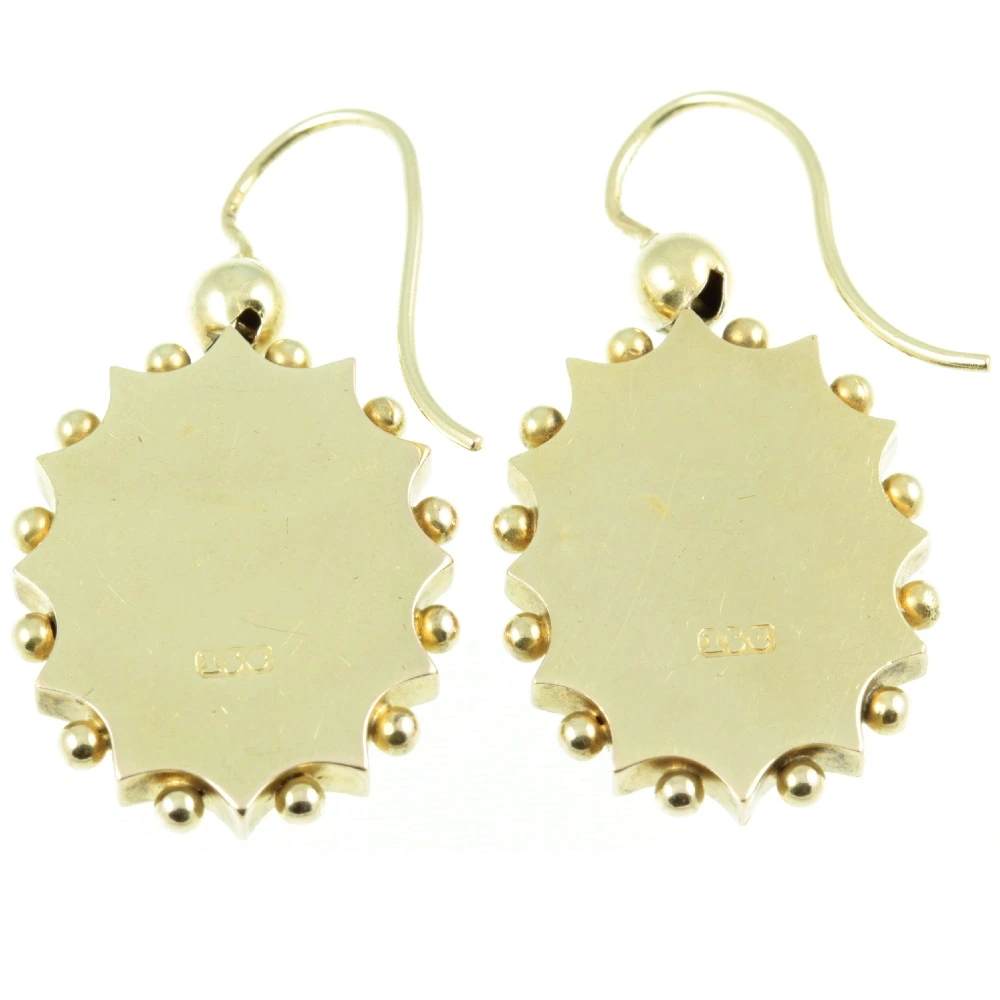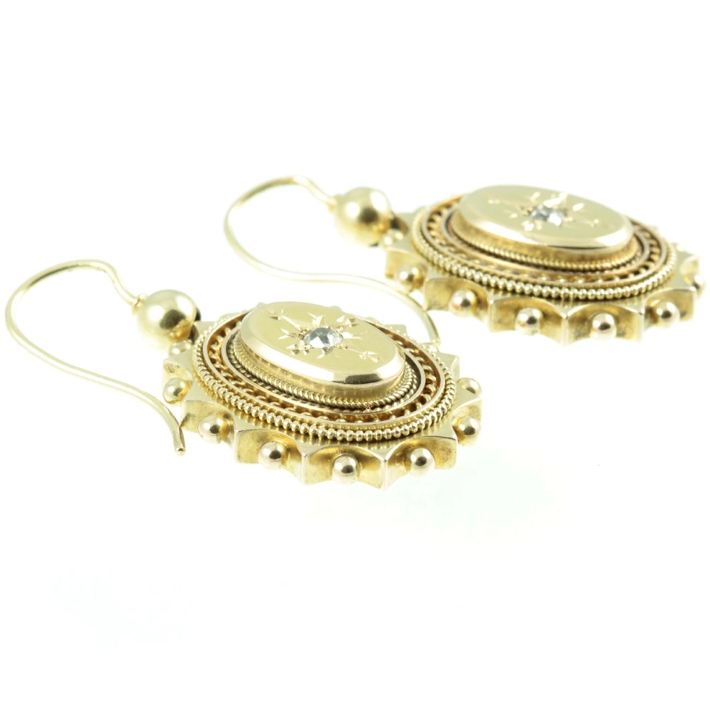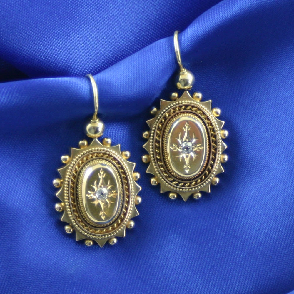 A pair of decorative Victorian 15ct Gold and Diamond earrings. These beautiful drop earrings are made from rich 15ct gold and feature a diamond on a raised plinth. Each round-cut diamond is secured by a claw setting and is accentuated by elaborate carvings. The combined weight of both diamonds is 34 points. Surrounding each raised plinth is a border of four gold ropes and finished with a recessed beaded edge. A beautiful example of intricate Victorian jewellery, as well as being of timeless design.