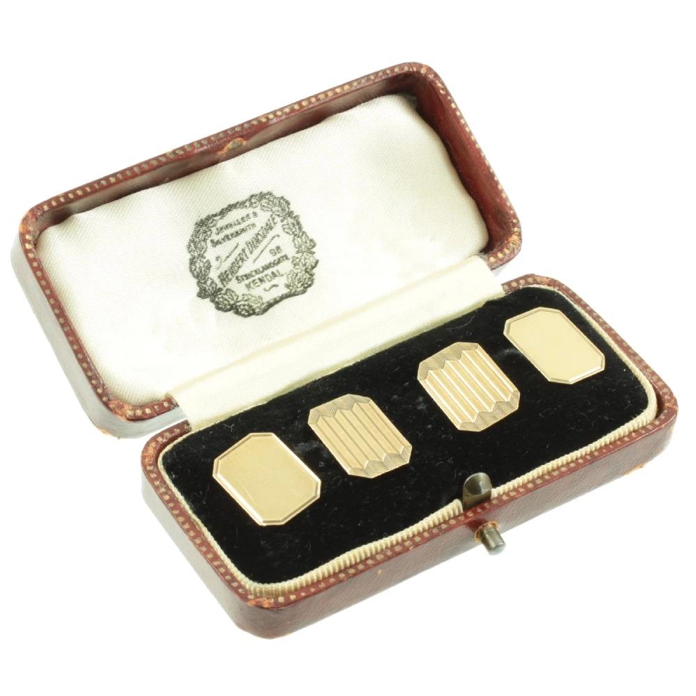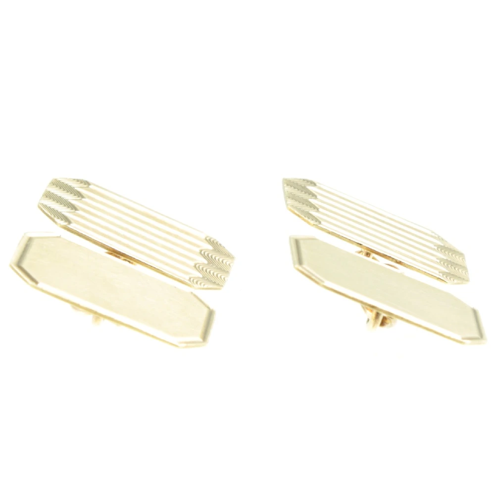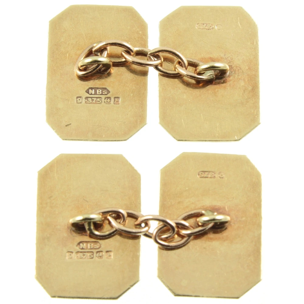 A meticulously crafted pair of Victorian 9ct Gold cufflinks. These rectangular-shaped cufflinks have been made from 9ct yellow gold and feature geometric detailing. They are connected together with gold cable link chains and this pair of cufflinks come in their original fitted case.