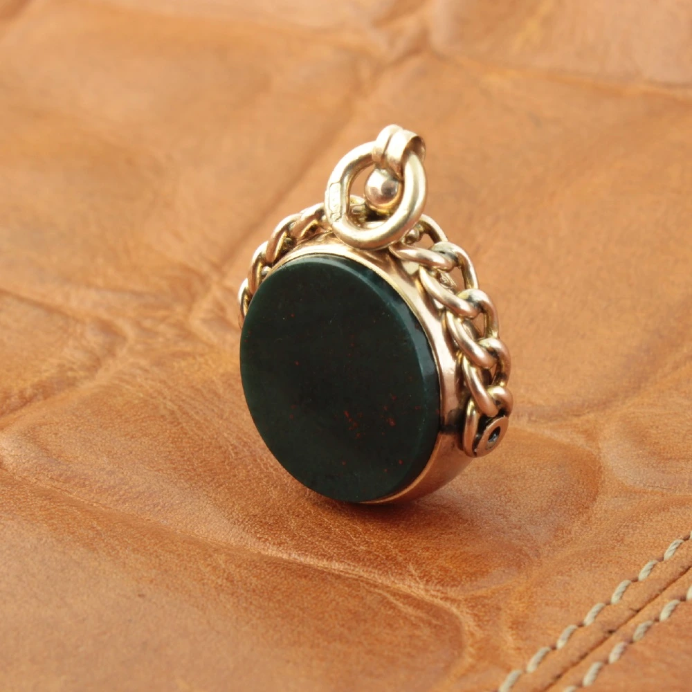 A classic Victorian 9ct gold swivel fob. Containing a bloodstone on one side, with a carnelian gemstone on the other side. This beautifully designed fob is hallmarked for Birmingham 1894.