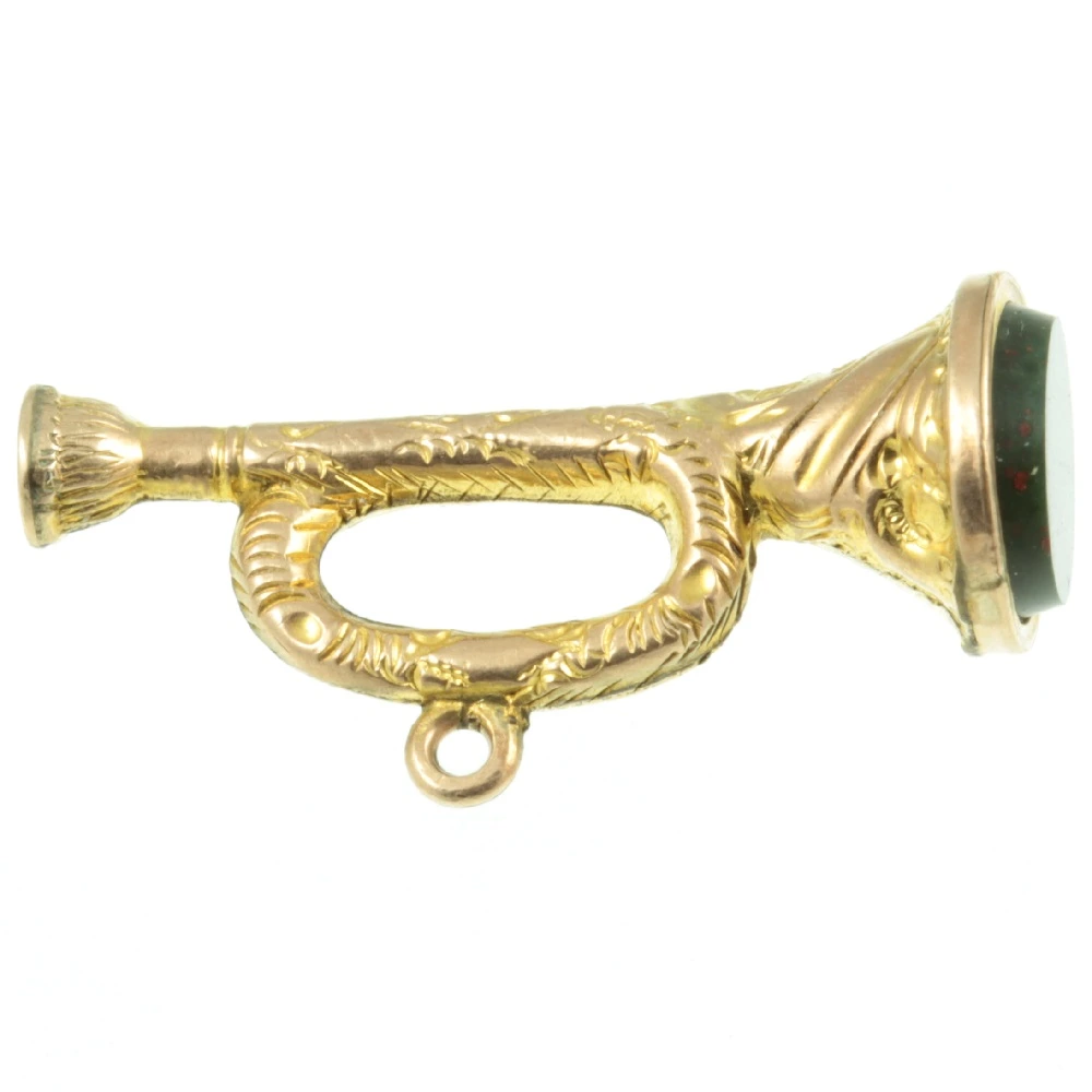 A decorative Victorian Bloodstone Fob Charm. An exquisite bugle charm made of rich 15ct yellow gold, with a bloodstone set in the bell. A timeless piece of fine antique jewellery.