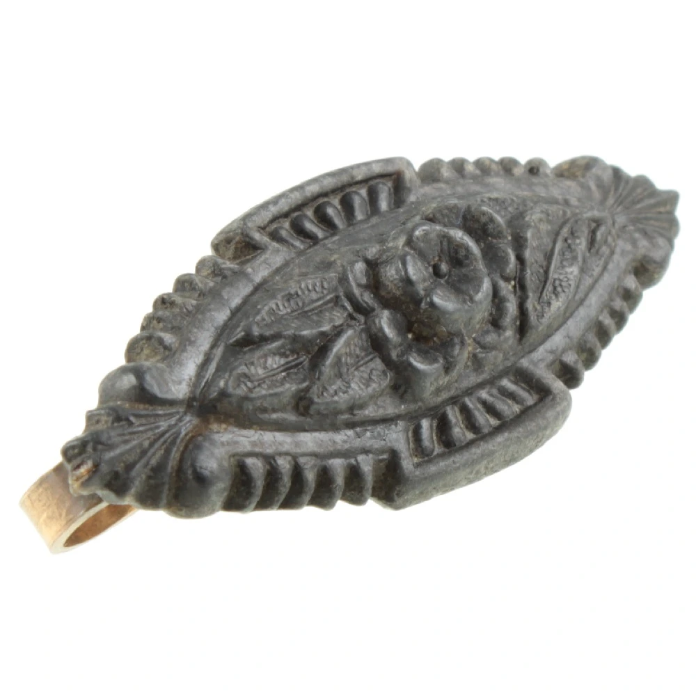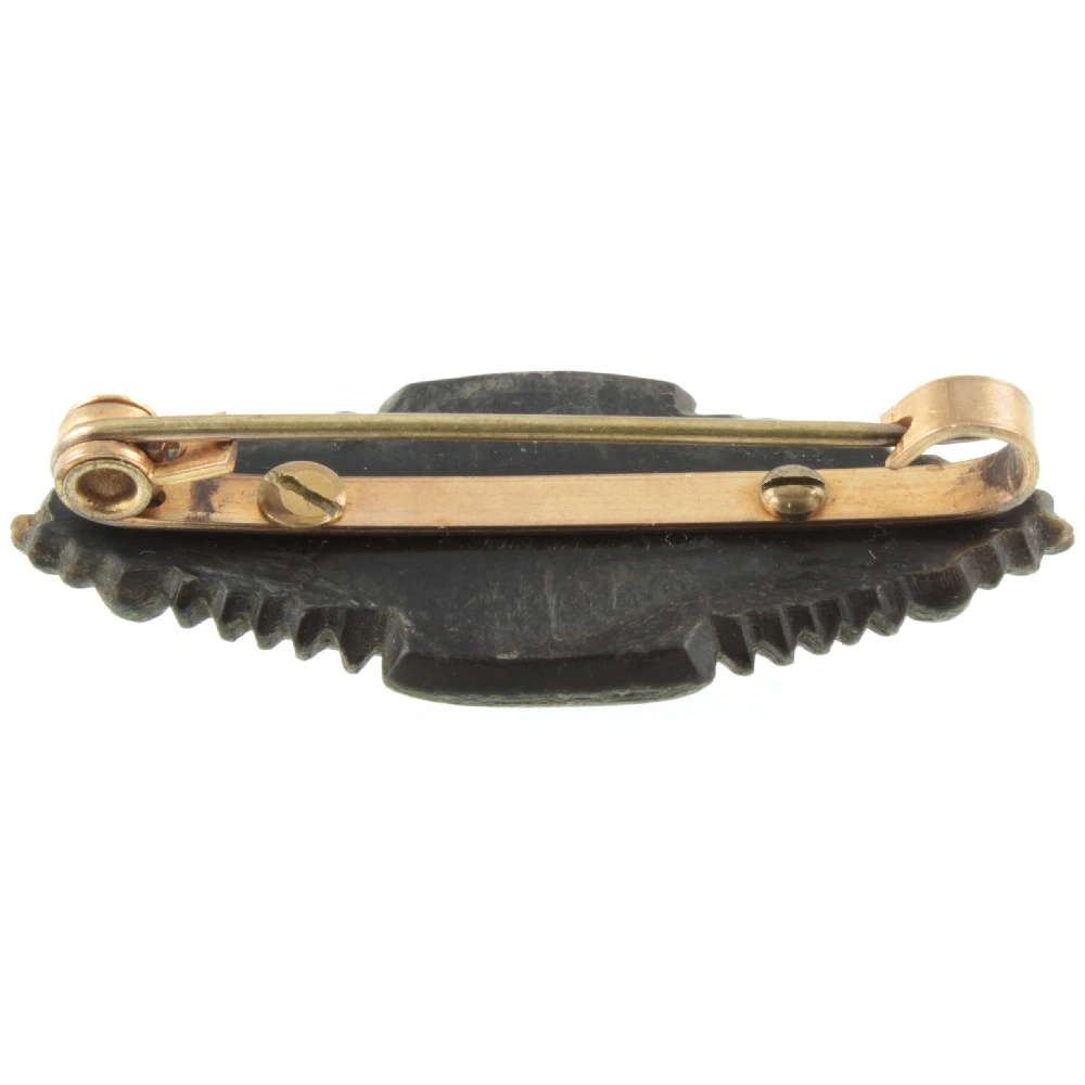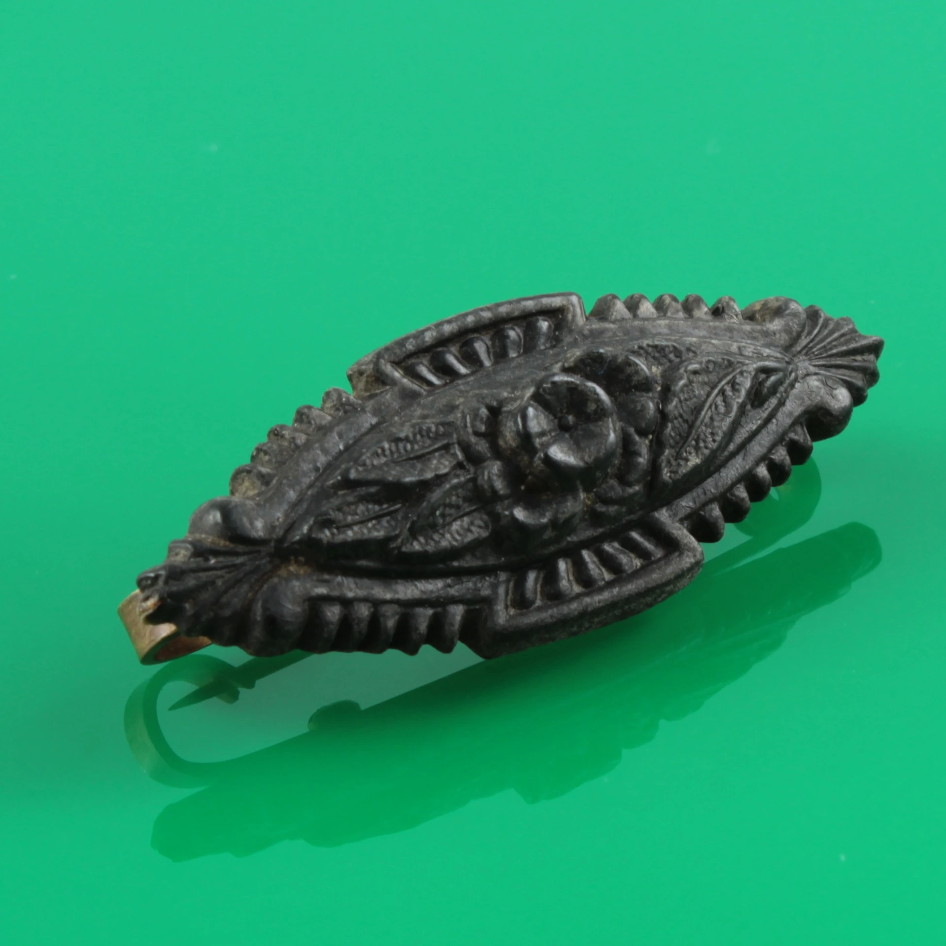 A skillfully crafted Victorian Bog Oak mourning brooch. An oval-shaped piece of bog oak has been carved with a floral design in relief. Fitted with a brass spring-mounted pin to the back.