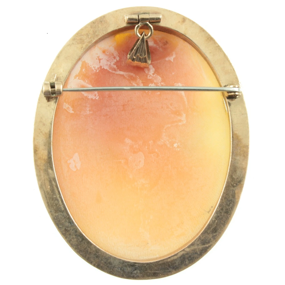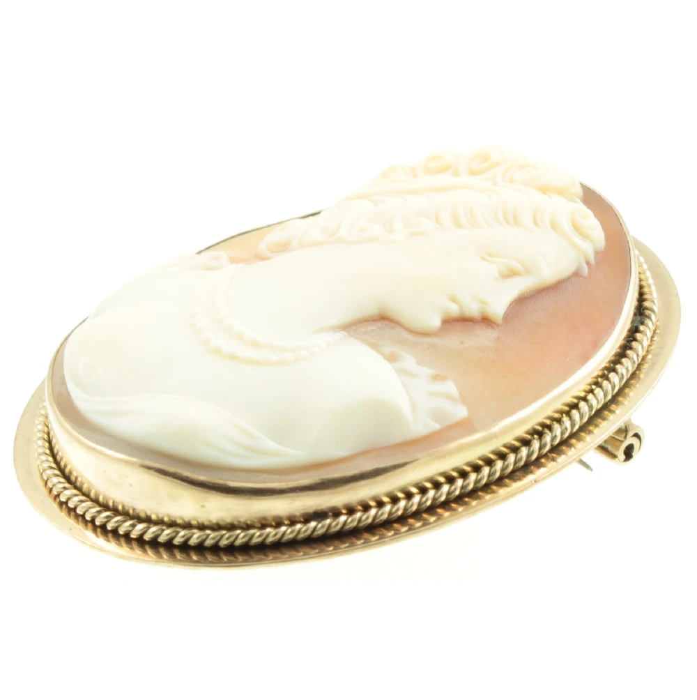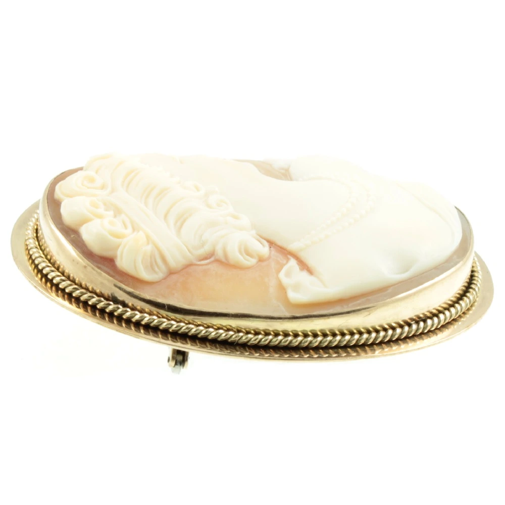 An intricately carved Victorian Cameo Shell brooch. This cornelian shell has been beautifully carved to depict the profile of a lady. Cornelian shells are comprised of two layers, a white marble-type layer and a darker normally light brown layer. This allows the carver to create a contrasting background. This cameo is mounted in a 9ct gold surround featuring a single twist rope and can be worn as a pendant as well as a brooch. A beautiful example of Victorian craftsmanship.