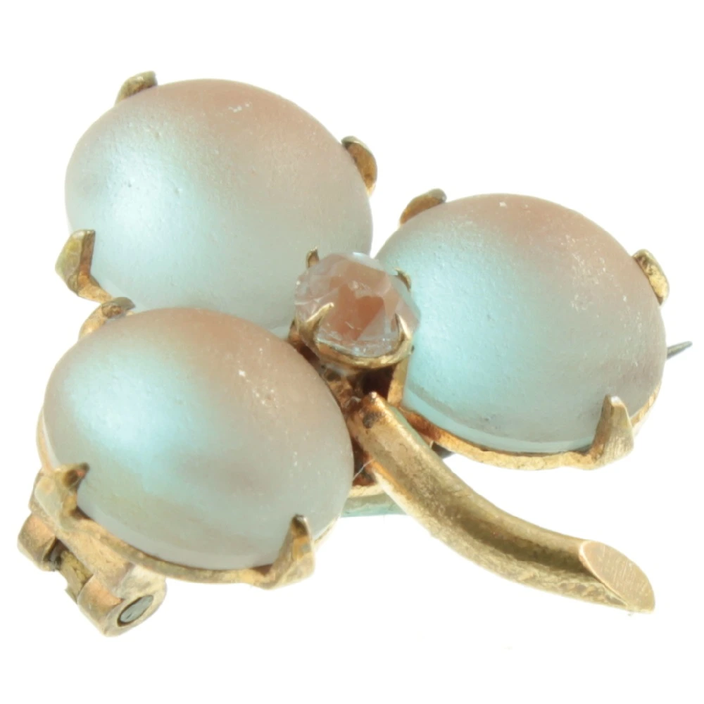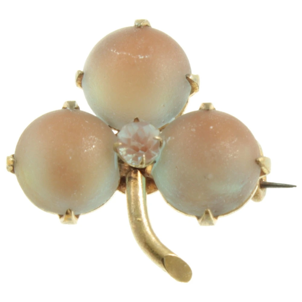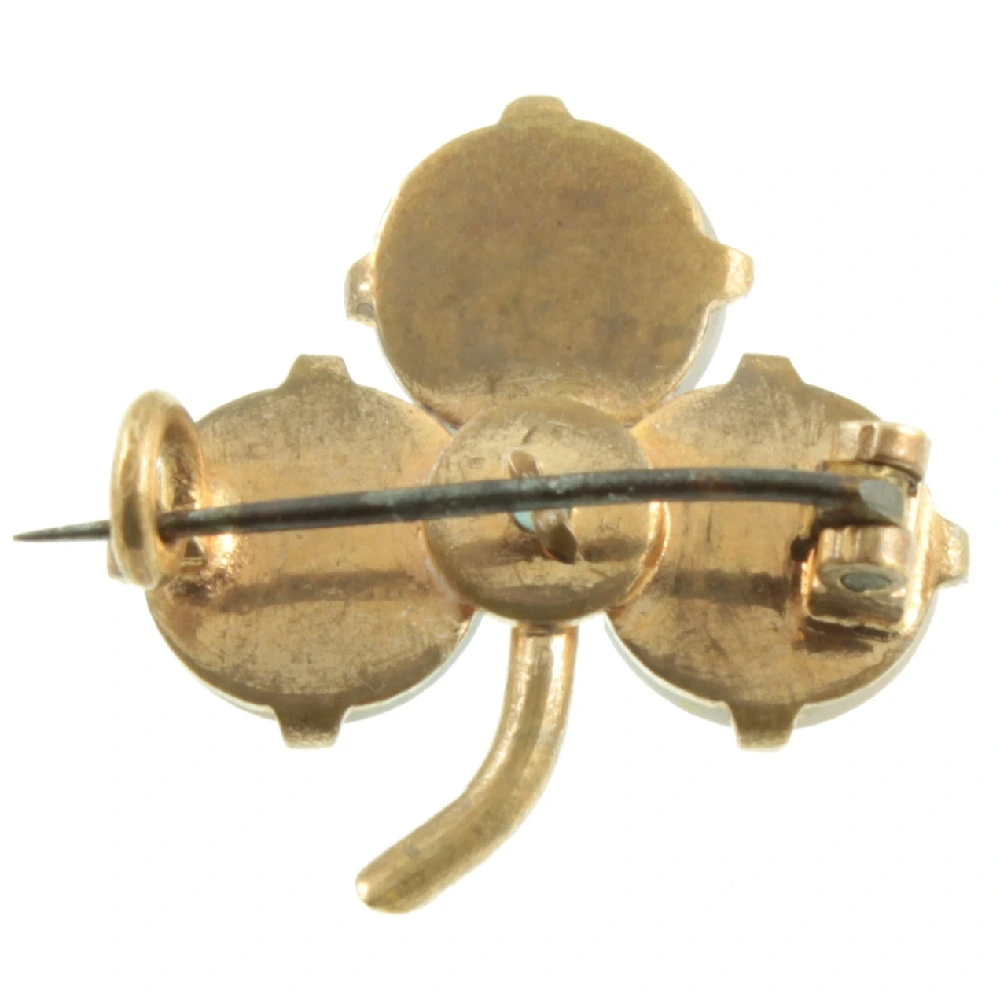 A pretty Victorian Saphiret Clover Brooch. Three Saphiret glass hemispheres have been set in a closed-back gold-tone setting, with a single rhinestone in the centre. Saphiret glass is made by adding gold to sapphire-coloured glass and was produced in Gablonz, Czechoslovakia during the 19th century. A well-made and rare piece of antique costume jewellery.