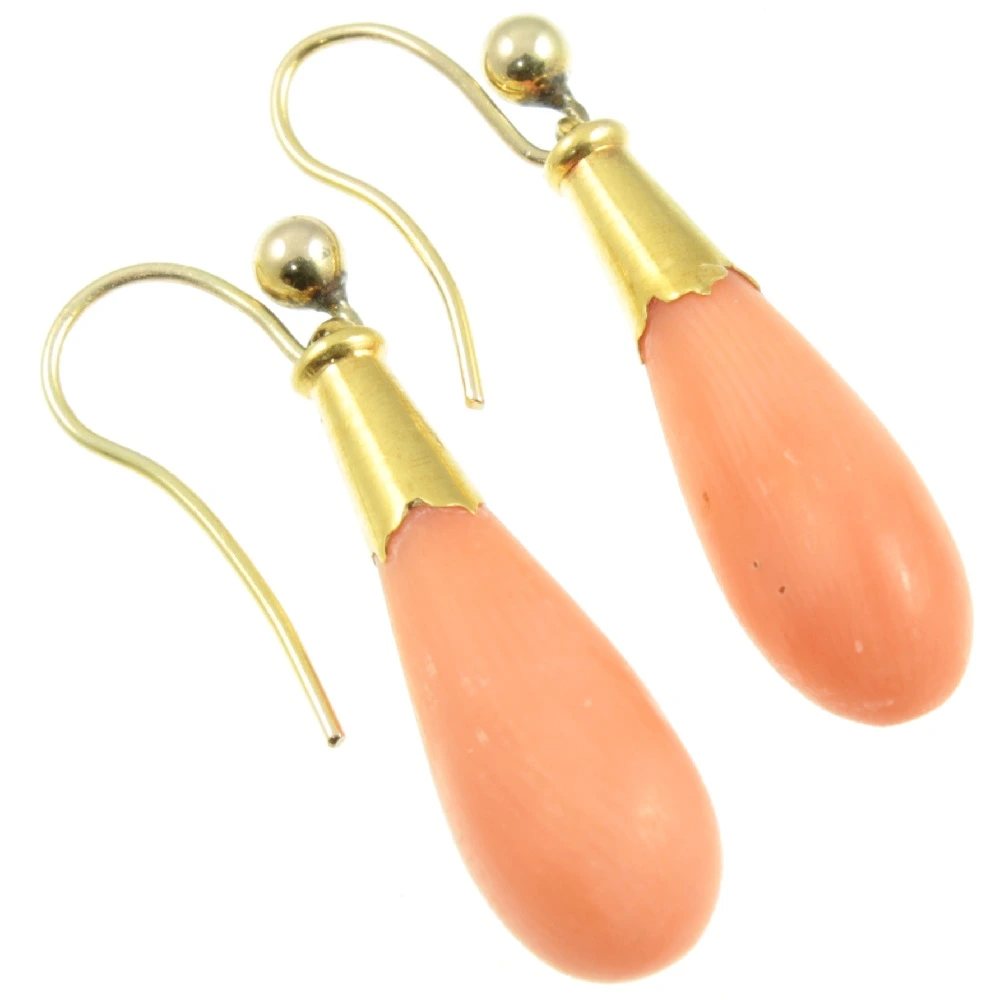 A stylish pair of Victorian Coral drop earrings. Teardrop-shaped coral has been set in 9ct yellow gold, with shepherd hook backs. A classic pair of earrings, that would suit any occasion.