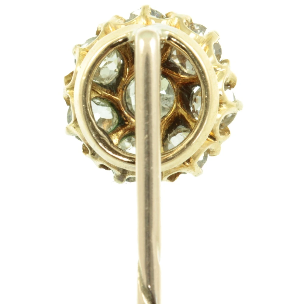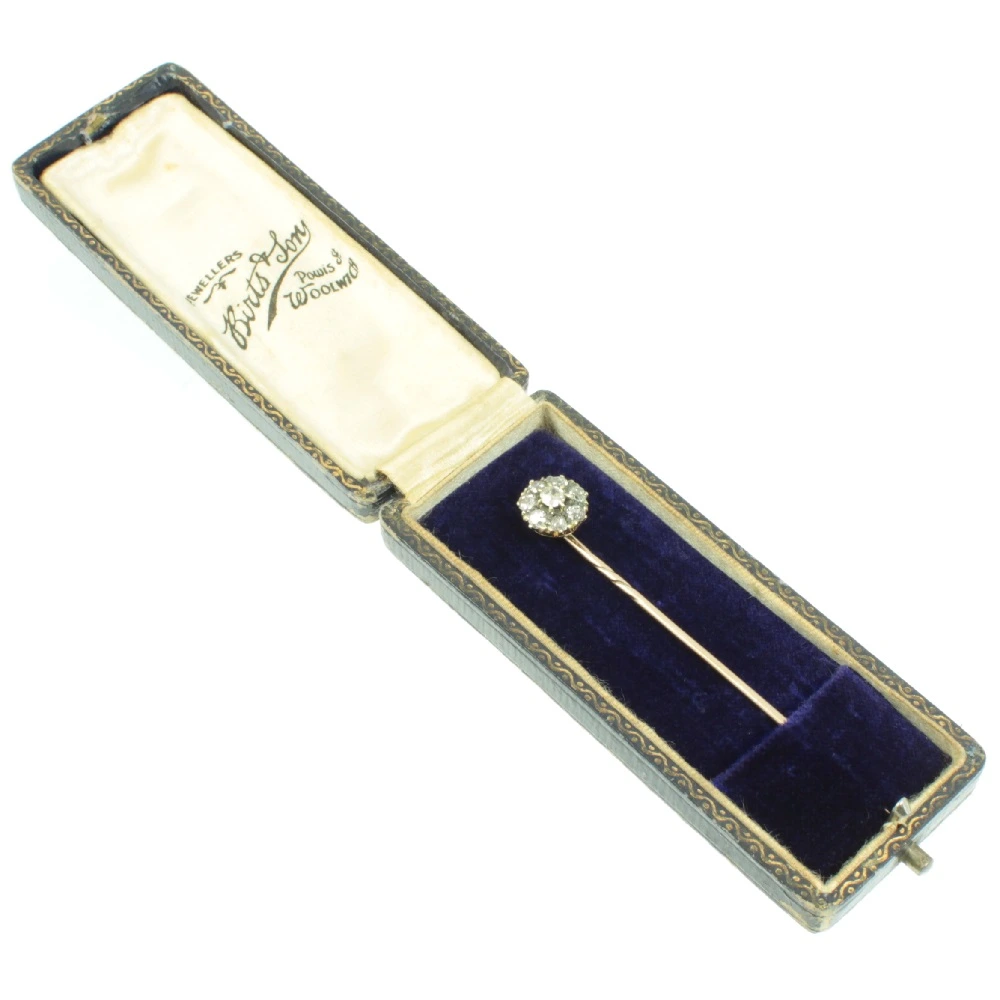 A striking old-cut Victorian diamond tie pin. A central diamond weighing 15 points has been mounted in 18ct yellow gold and is surrounded by seven diamonds weighing eight points each. These diamonds have excellent clarity, which allows them to catch the light beautifully. This tie pin is presented in its original box. Circa 1880s.