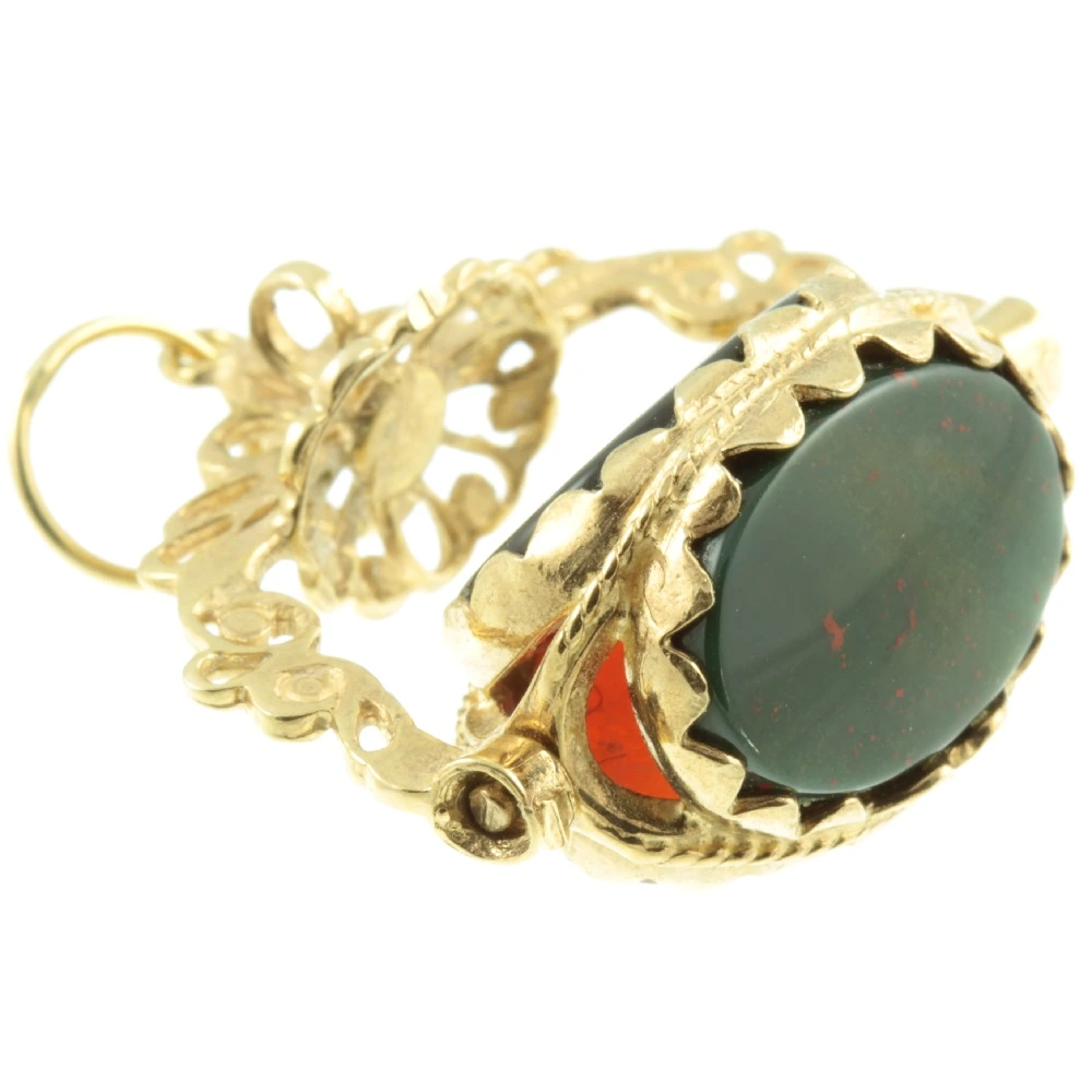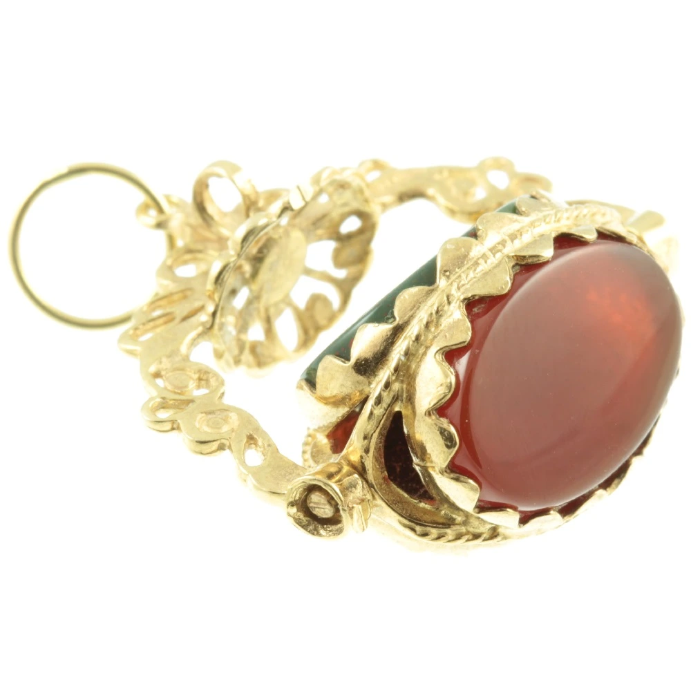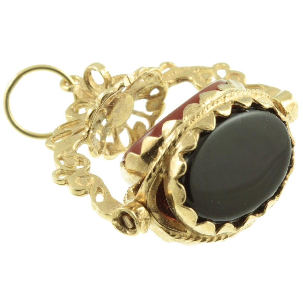 An elaborate Victorian triple sided fob pendant. Three oval gemstones, a bloodstone, onyx and a carnelian each uncarved are set in 9ct yellow gold to form a swivelling fob. The ornate and intricate design of this fob showcases the very high standard to which Victorian jewellers worked. A well-made and wearable piece of fine antique jewellery.