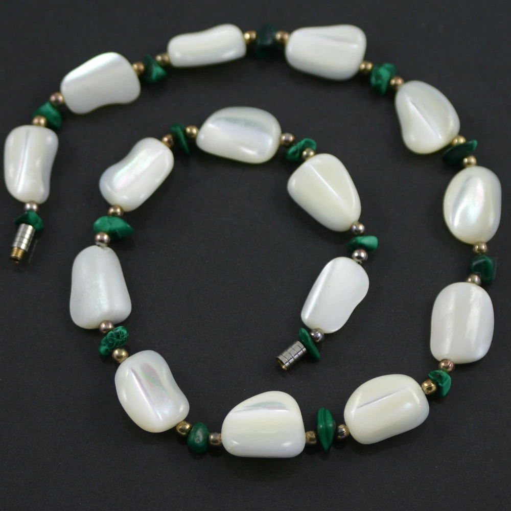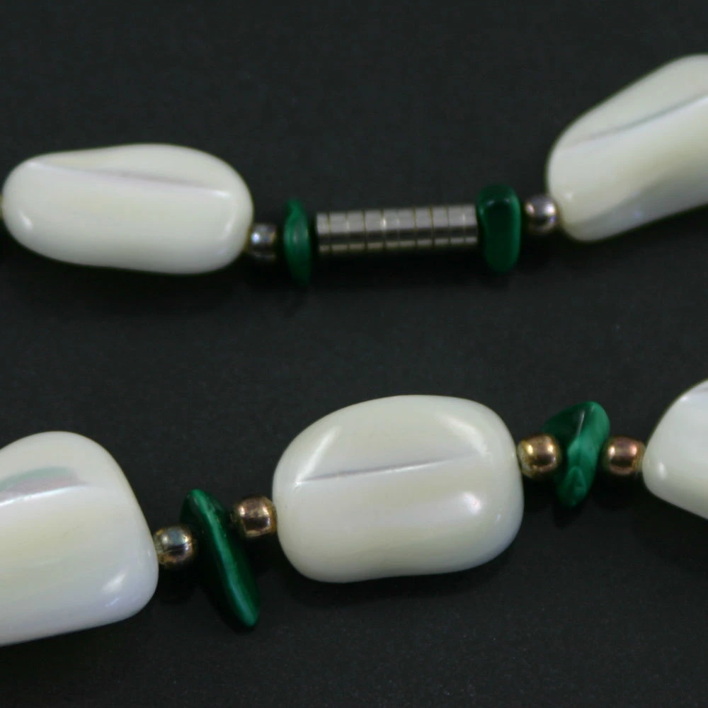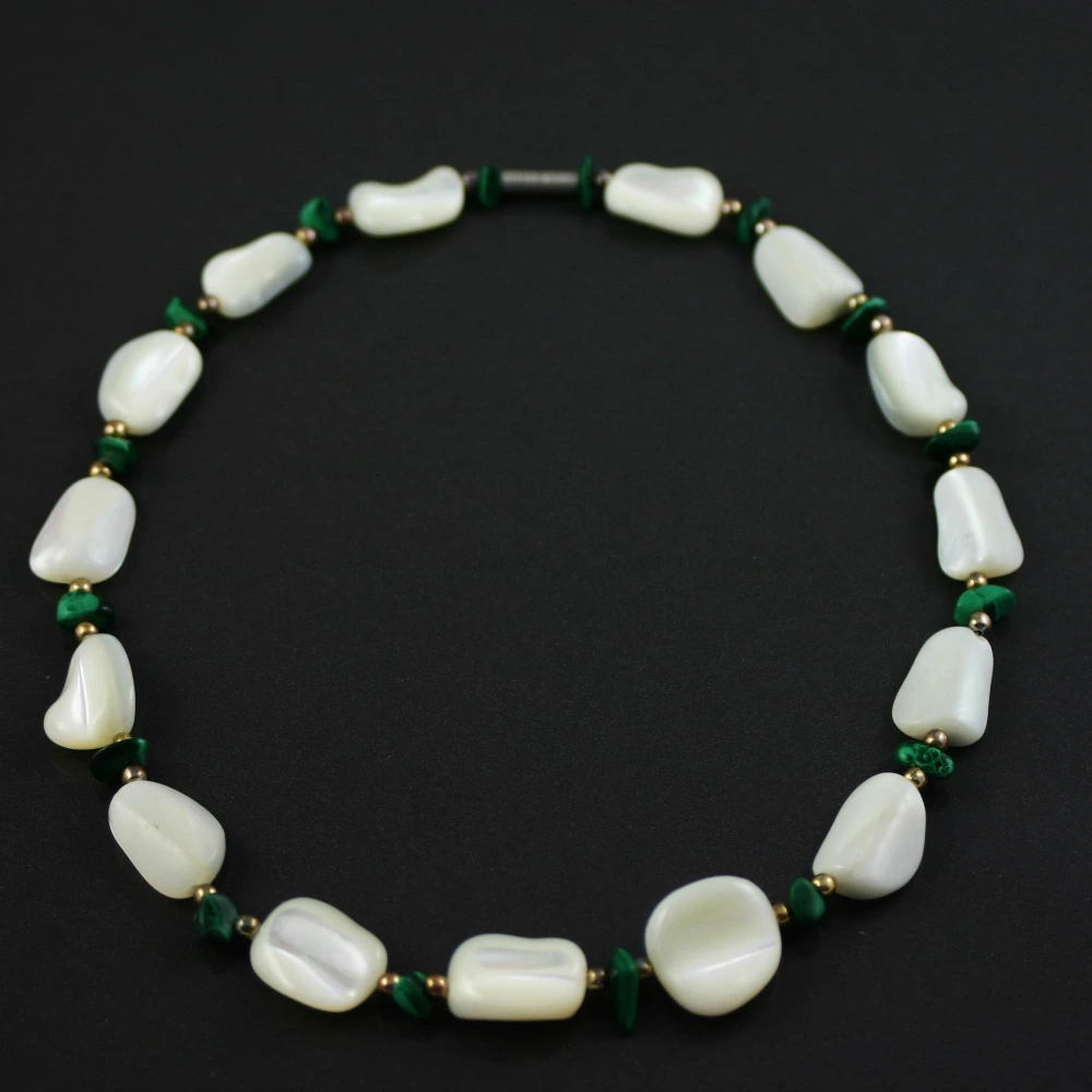 An eye-catching Mid-Century White Agate and Malachite Necklace. Highly polished white agate nuggets, together with malachite nuggets have been hand-strung and set to a barrel clasp. These polished agate nuggets have a luxurious shine which contrasts beautifully with the rich green malachite nuggets. A one-of-a-kind piece.