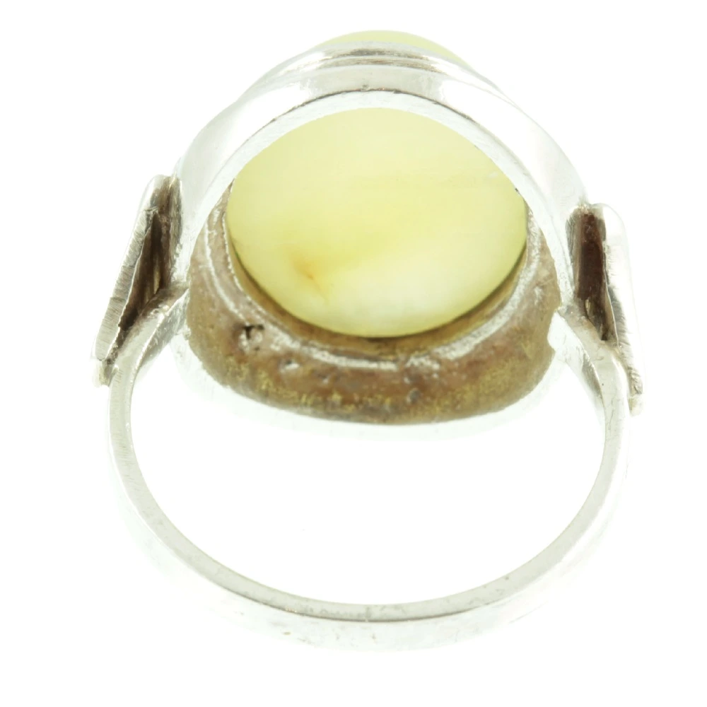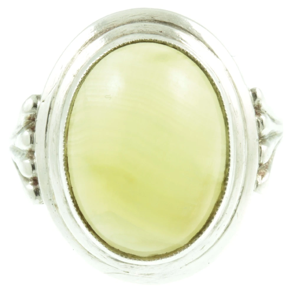A lovely Vintage White Agate Silver Ring. An oval cabochon white agate gemstone weighing 8ct is mounted using a rub-over setting in silver. Around the base of the gemstone is a milgrain border, which adds that extra sparkle to the stone. This border is further accentuated by a series of steps below the gemstone which cumulates in a decorative design to the shoulders. An eye-catching vintage ring.